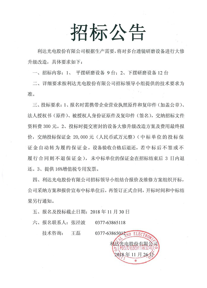 研磨設(shè)備大修升級改造招標公告
